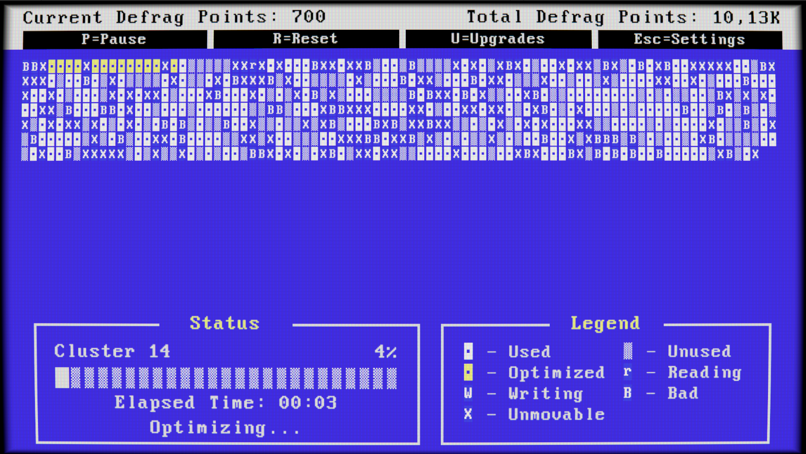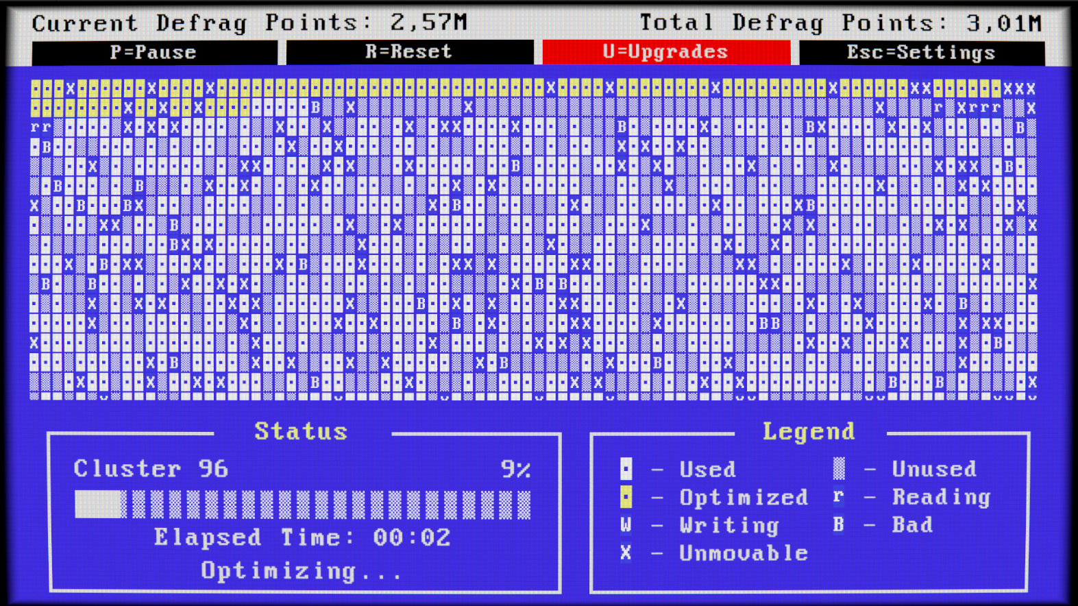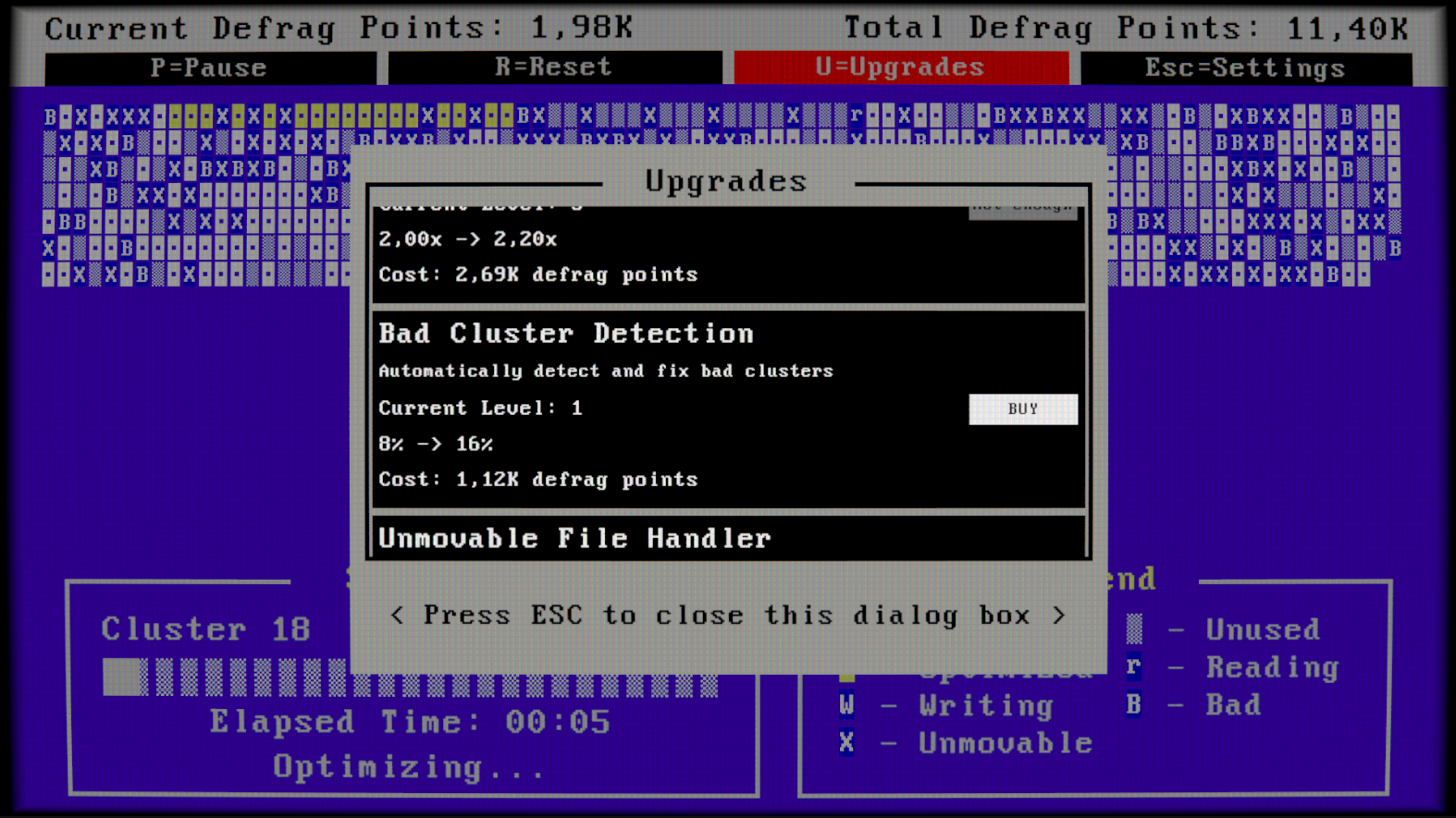 3) Add a speed bonus for completing a defrag, multiplied by the percentage fragmented at the end. Unmovable Files and unfixed Bad Sectors would count against this total, lowering your bonus. That would encourage the player to buy speed upgrades, while making the Unmovable File Handler upgrade basically a flat increase to your end of round bonus.